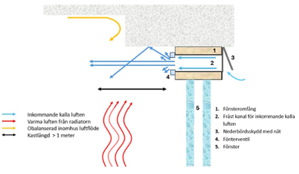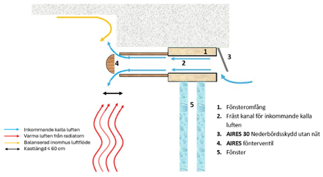 AIRES fönsterventiler fördelar och styr den inkommande kalla luften, vilket möjliggör en optimal inblandning med den varma luften från radiatorn för en balanserad ventilation. Fördelen blir en bättre termisk komfort i form av lägre lufthastighet i vistelsezonen med bibehållen optimal luftomsättning samt inget drag eller kallras. Redan 60 cm från ventilen har lufthastigheten sjunkit till under 0,15 m/s.
